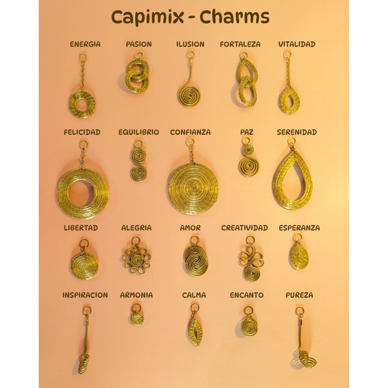 Los Capimix son colgantes multiusos de oro vegetal, elaborados a mano con capim dourado, una planta brasileña conocida por su brillo natural: