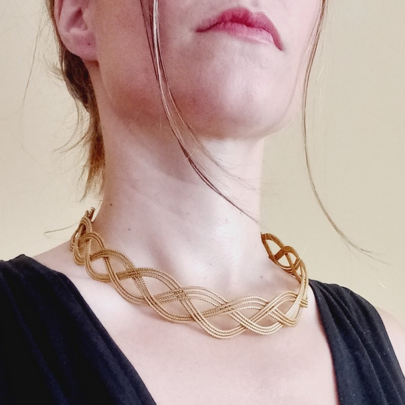 Este collar de oro vegetal diseña una amplia trenza con hilos de capim dourado espaciados. Sus curvas delicadas y trenzadas recuerdan a Waimakariri river, uno de los ríos trenzados más importantes de Nueva Zelanda. Es un accesorio indispensable para un evento importante o una velada especial. Su función es enmarcar tu cuello para realzar tus rasgos faciales.