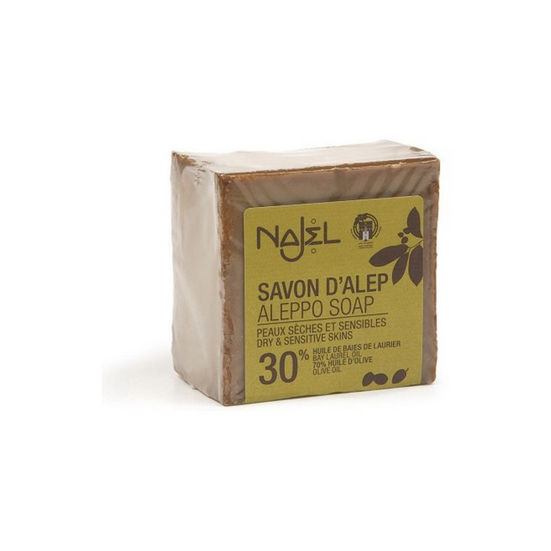 Este jabón de Alepo natural de Najel está elaborado con 30% de aceite de bayas de laurel, especialmente indicado para la higiene y cuidado de la piel seca y sensible.