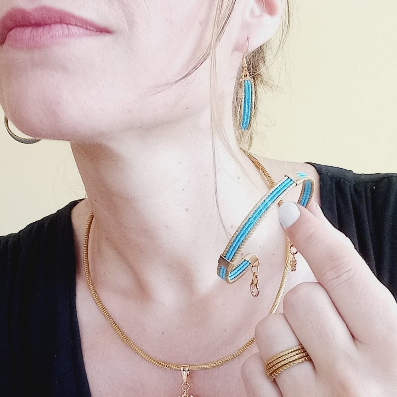 Unos hilos de capim dorado junto con un hilo de algodón de color perfectamente alineados gracias a dos hermosas placas cuadradas con un chapado en oro 3 micras.