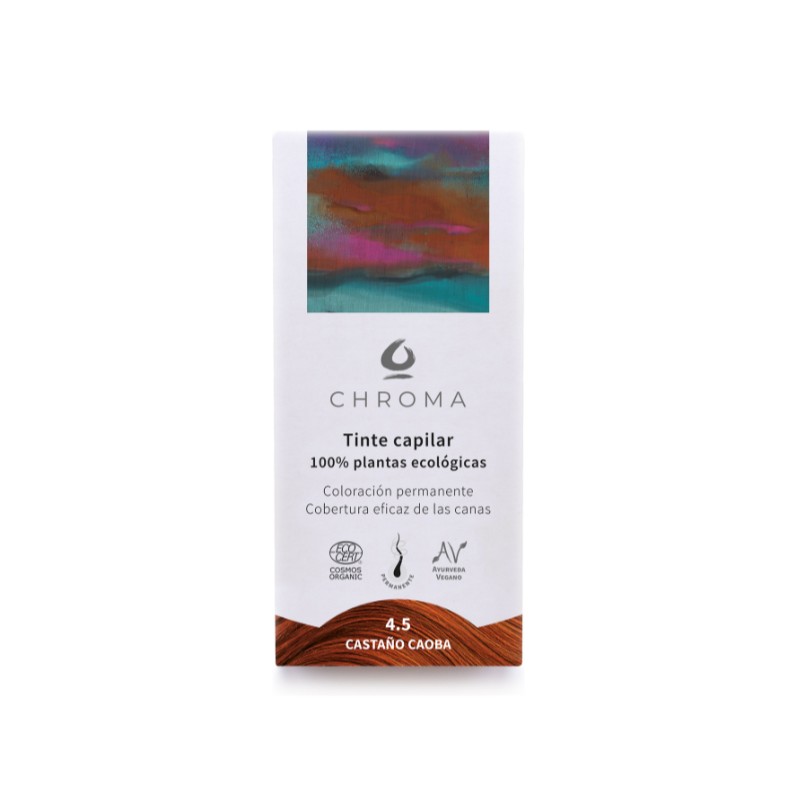 Descubre el tinte capilar 100% natural Castaño Caoba 4.5 de Chroma, formulado con 100% plantas ecológicas y de Comercio Justo.