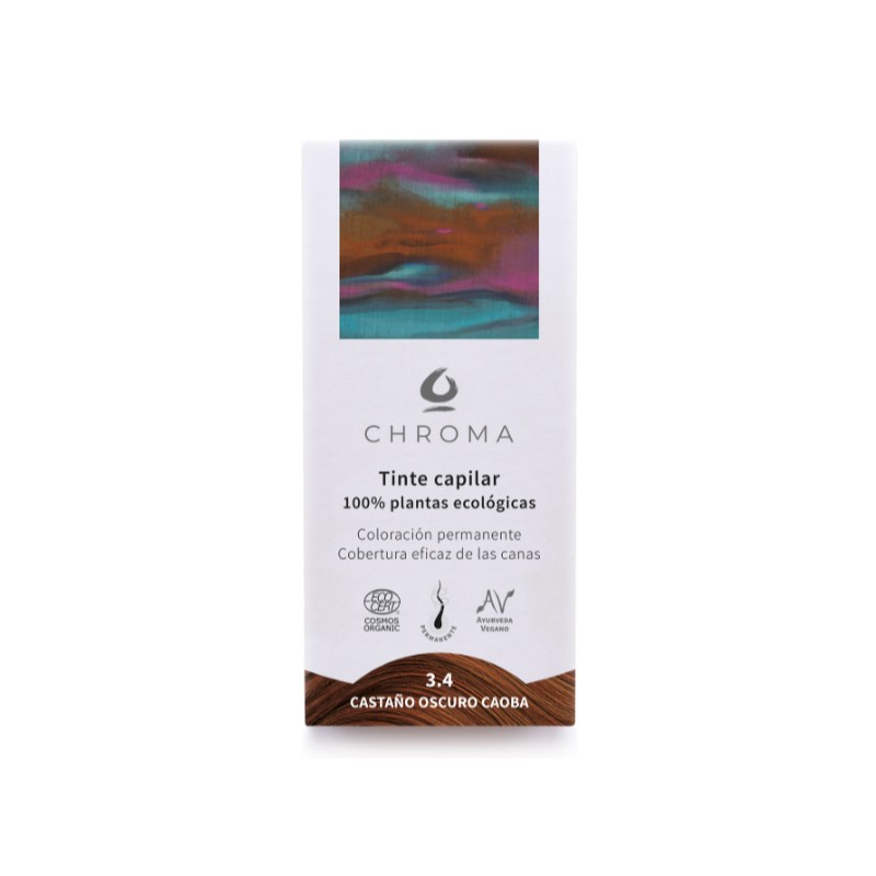 Découvrez la coloration capillaire 100 % naturelle Châtain Foncé Acajou 3.4 de Chroma, formulée avec 100 % de plantes biologiques issues du Commerce Équitable.
