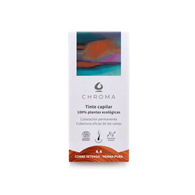 Découvrez la teinte 4.4 Cuivre Intense de CHROMA, formulée avec 100 % de henné (Lawsonia inermis) issu de l’agriculture biologique.