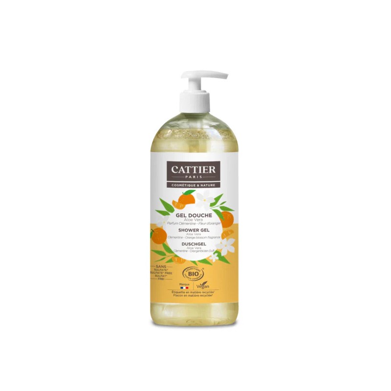 Le Gel Douche Bio Clémentine Fleur d’Oranger de Cattier offre un nettoyage doux et respectueux de la peau grâce à sa formule sans sulfates ni savon.