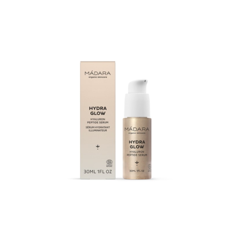 Le sérum hyaluronique aux peptides Hydra Glow est présenté dans un flacon en PET recyclable.