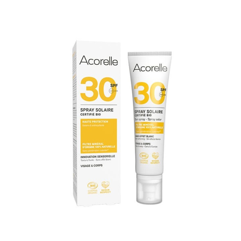 Ce protecteur solaire bio de Acorelle offre un facteur de protection solaire élevé, SPF 30 et a un format pratique en spray.